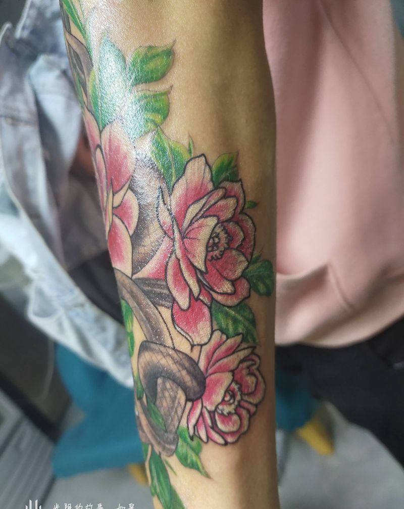 本来是小清新线条客人要求上色纹身图片_手臂手部新传统New School花,蛇纹身图案