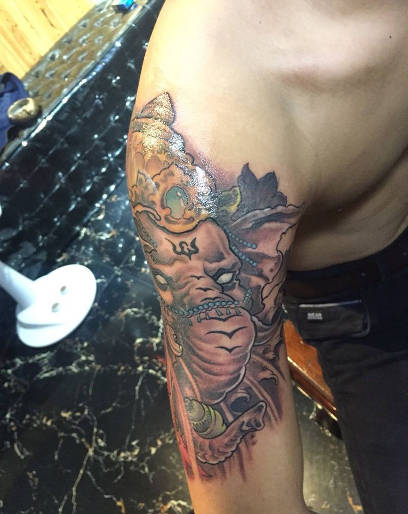 当前位置: 首页 >江苏省南通市纹身店-南通黑客纹身纹身图案>大臂象神纹身图片