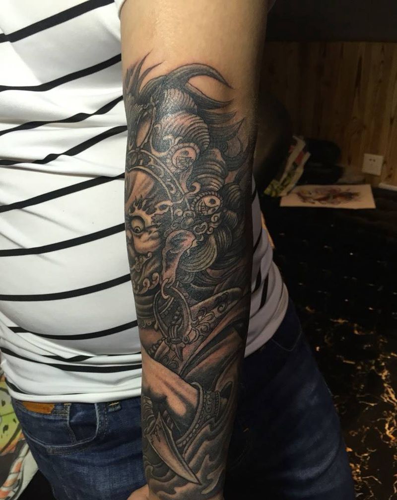 当前位置: 首页 >江苏省南通市纹身店-南通黑客纹身纹身图案>大黑天纹身图片_成品手稿手臂传统人物纹身图案