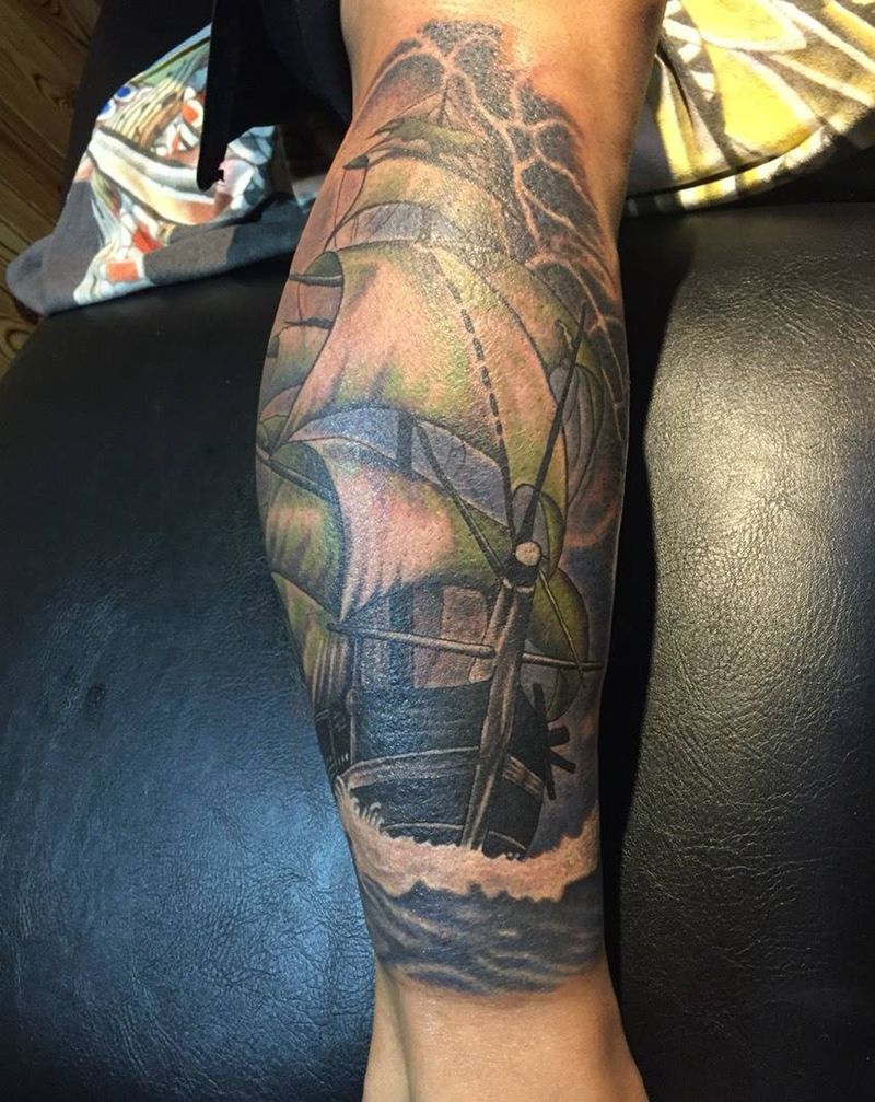 帆船纹身图片_成品插画腿部欧美写实静物纹身图案