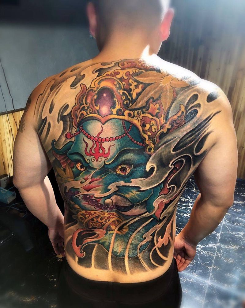 满背遮盖作品,象神纹身图片