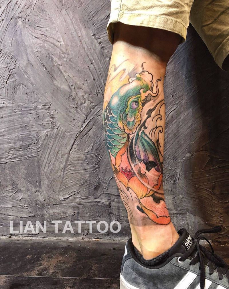缤纷锦鲤纹身图片_腿部老传统纹身图案