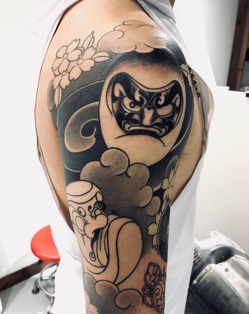 原创日式接花臂 达摩蛋 樱花 面具纹身图片_手臂老传统新传统纹身图案