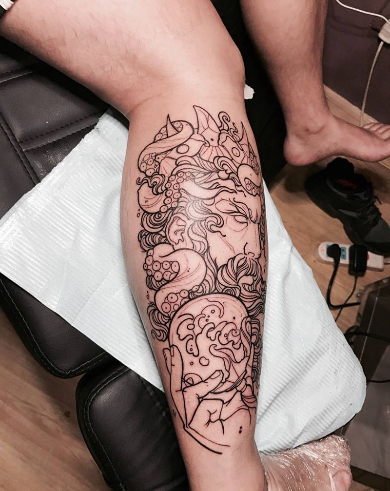 海神波塞冬纹身图片_腿部Old SchoolNew School纹身图案