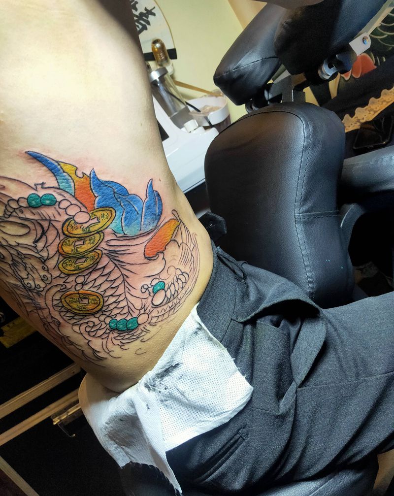 • T网红王老大花腿龙纹身图片_腿部新传统纹身图案