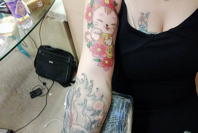 当前位置: 首页 >江苏省连云港市纹身店-彫洁刺青纹身图案>这是一只招桃花的猫纹身图片_手臂纹身图案