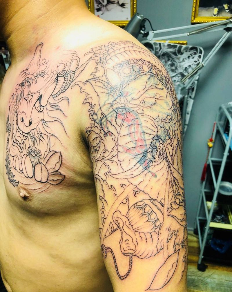 • T网红王老大花腿龙纹身图片_腿部新传统纹身图案