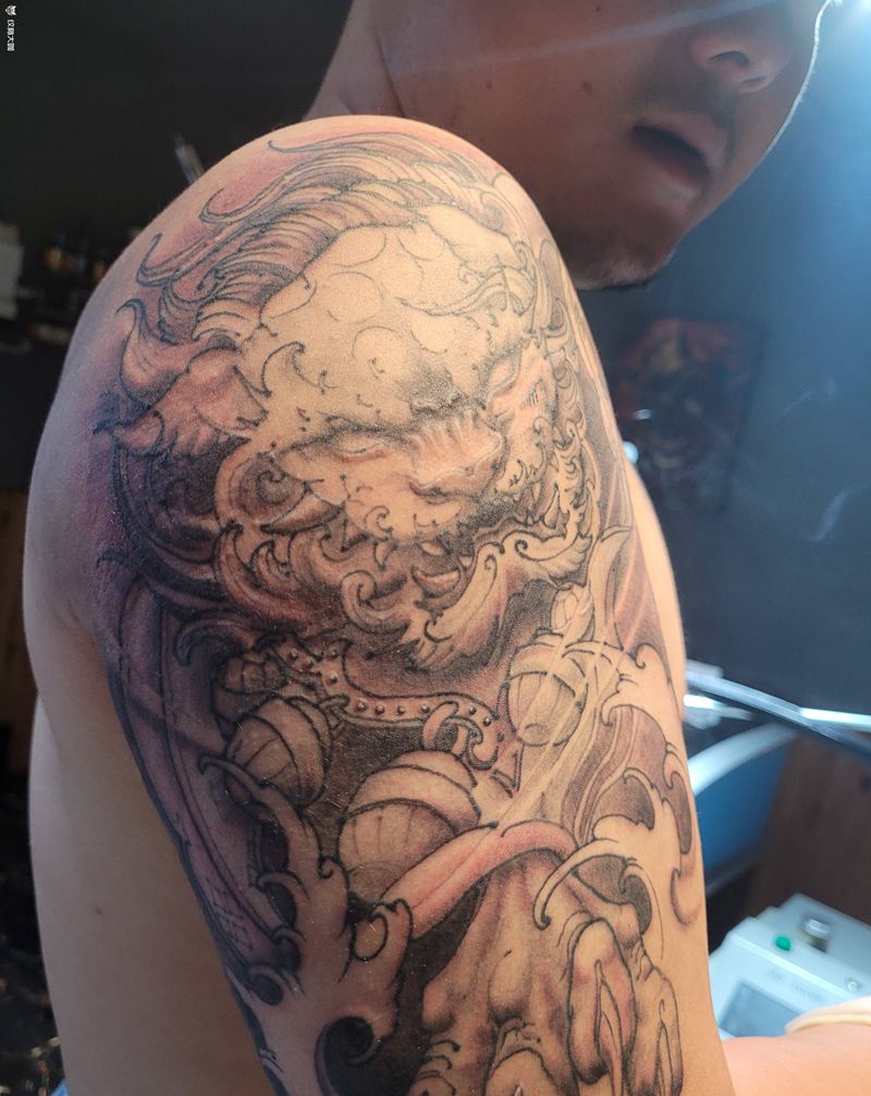 新传统唐狮纹身图片_手臂新传统唐狮纹身图案