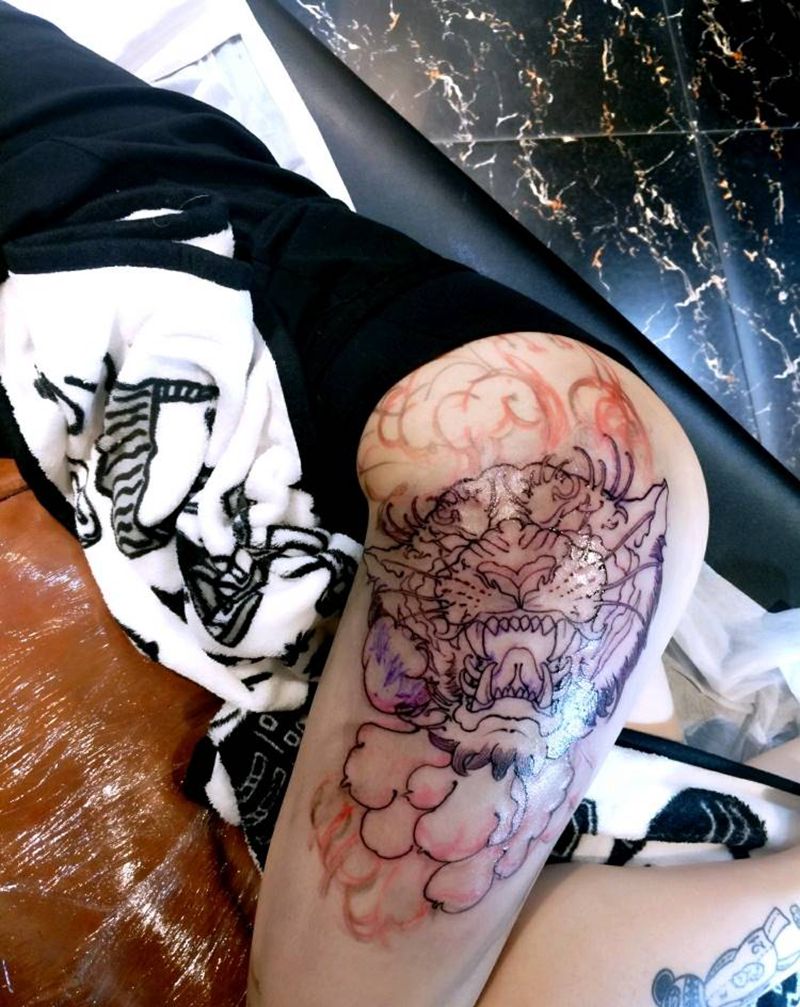 当前位置: 首页 >江苏省南通市纹身店-黑客纹身纹身图案>虎纹身图片_臀部腿部New School新传统纹身图案