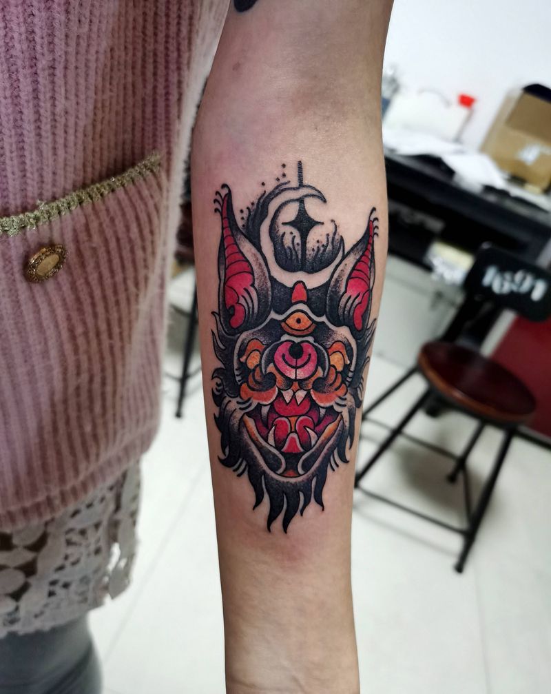 当前位置: 首页 >江苏省盐城市纹身店-标刺青纹身工作室纹身图案>蝙蝠!!纹身图片_手臂Old School纹身图案