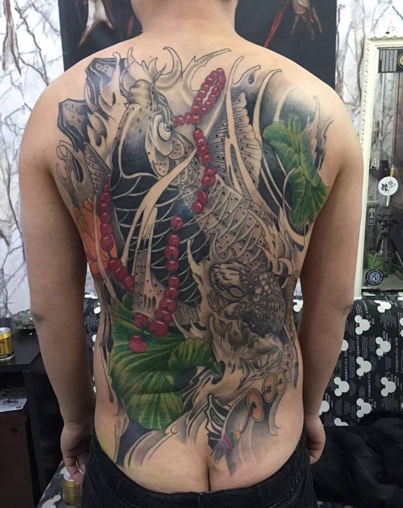 当前位置: 首页 >江苏省淮安市纹身店-忠义堂刺青纹身图案>锦鲤纹身图片_成品背部传统植物动物纹身图案