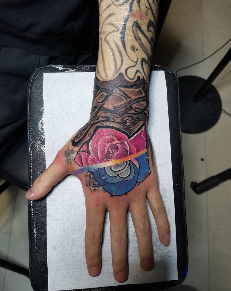 • 手背潮流时尚的玫瑰花眼睛纹身图案
