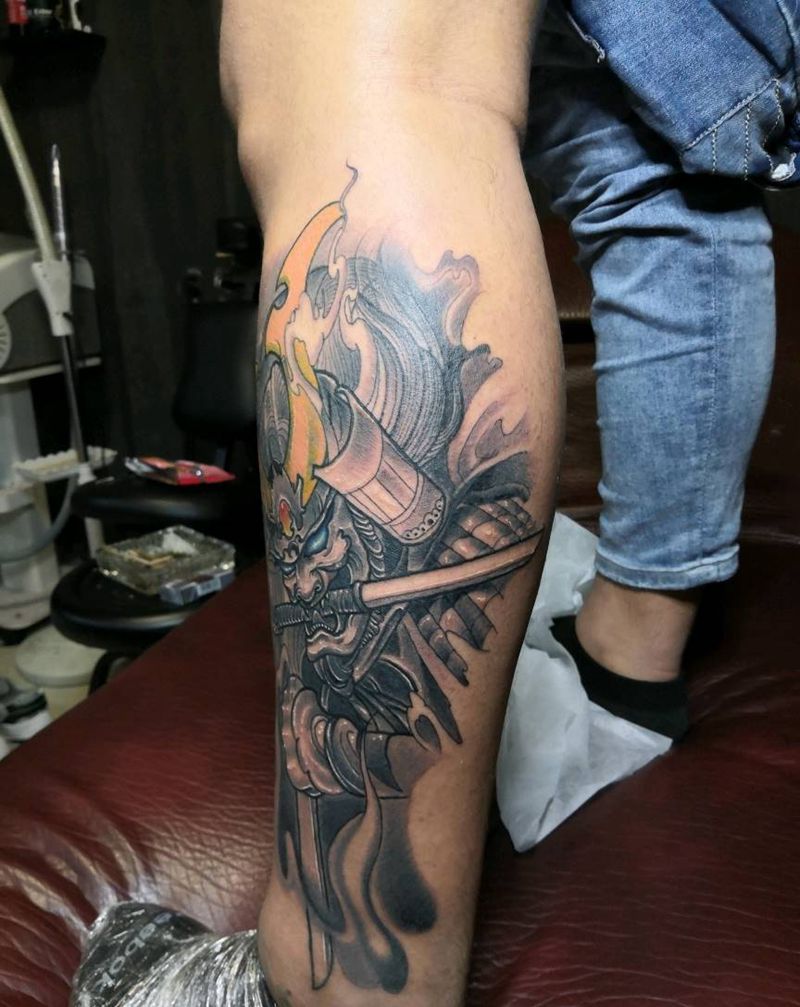 鬼武士 三刀流纹身图片_腿部新传统纹身图案