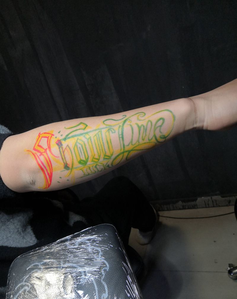 当前位置: 首页 >江苏省盐城市纹身店-十三刺青纹身图案>show time 花体字纹身图片_手臂花体字纹身图案