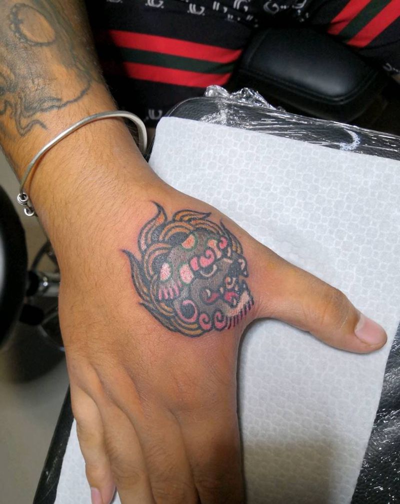 日式小狮子 遮盖字母纹身图片_手部老传统纹身图案