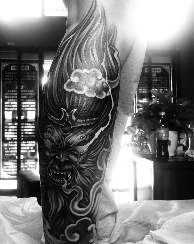 • T网红王老大花腿龙纹身图片_腿部新传统纹身图案