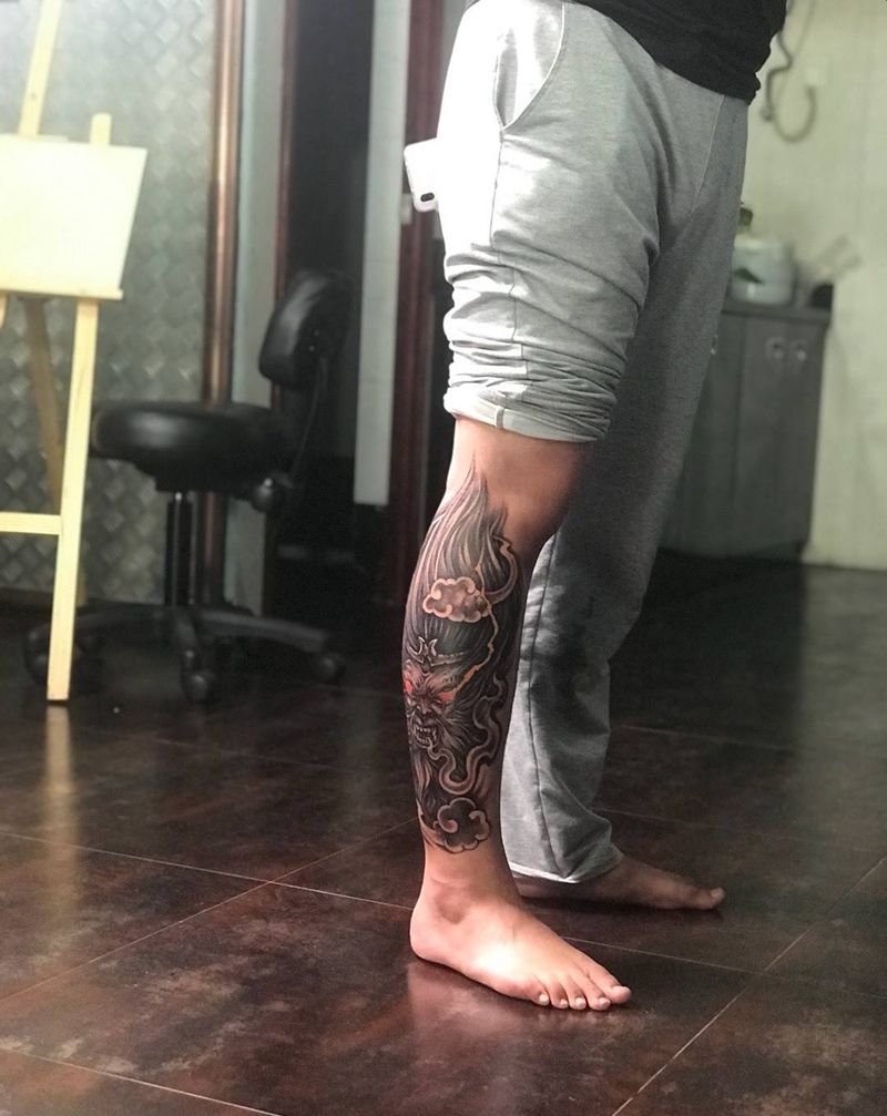 • T网红王老大花腿龙纹身图片_腿部新传统纹身图案