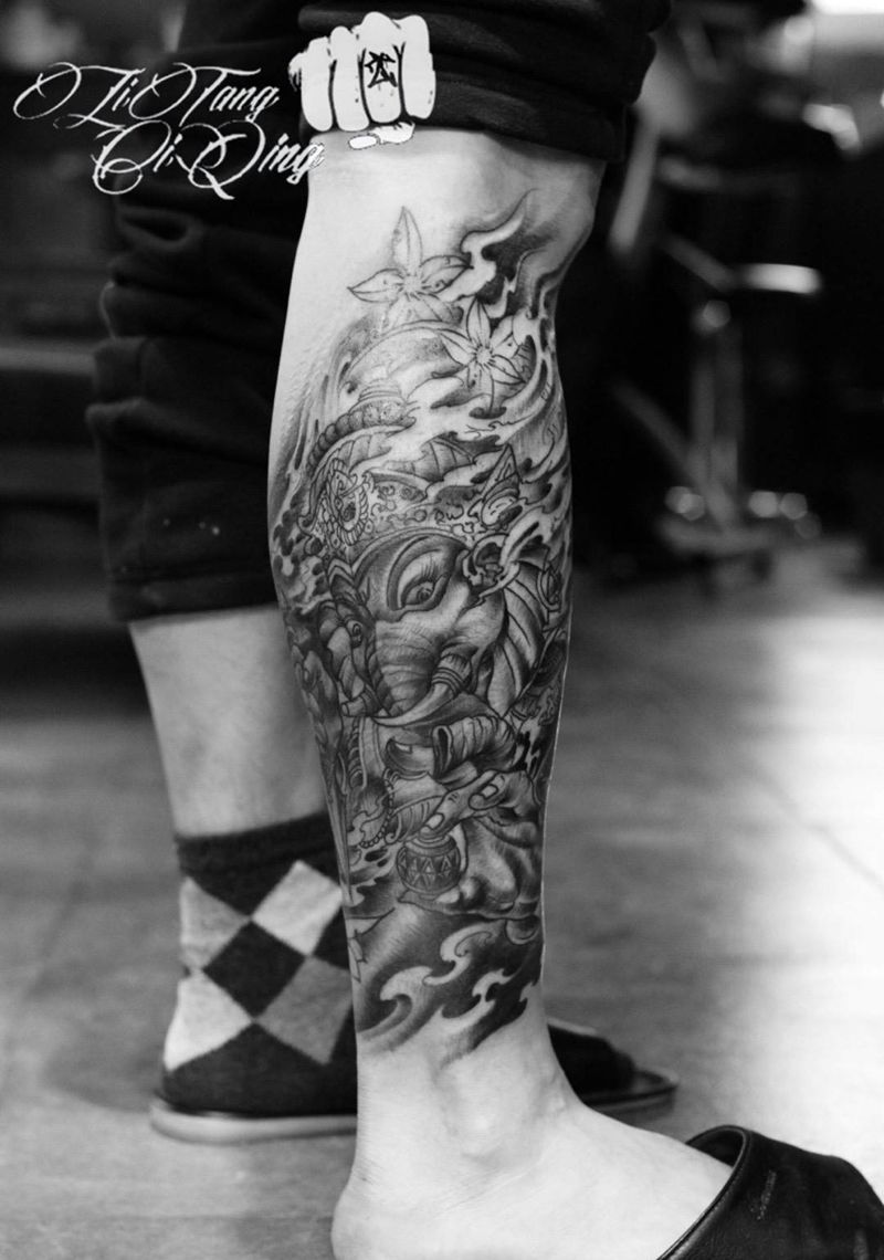 一只小象纹身图片_成品腿部传统习俗宗教动物静物鬼神纹身图案
