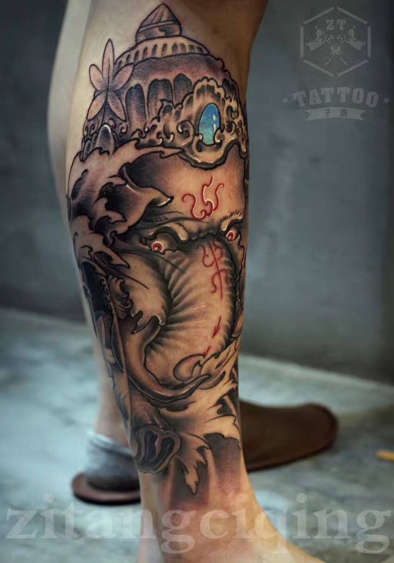 • T网红王老大花腿龙纹身图片_腿部新传统纹身图案