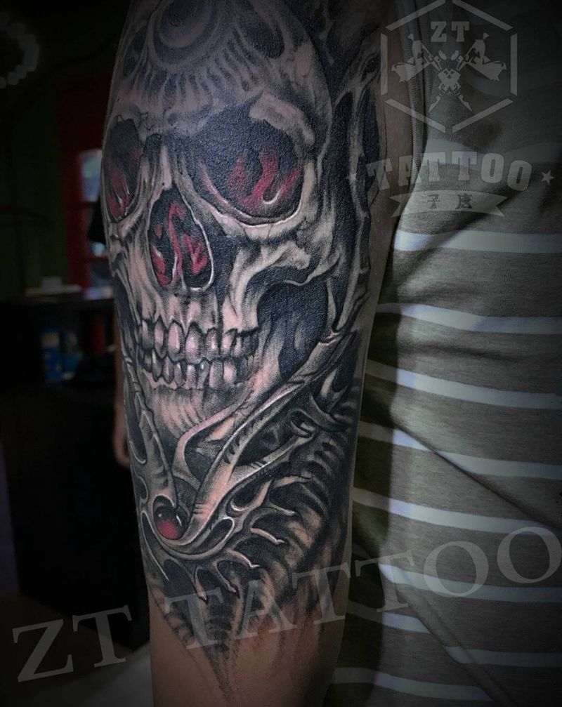 当前位置: 首页 >江苏省扬州市纹身店-囍欢刺青纹身图案>欧美机械骷髅纹身图片_成品手臂欧美写实鬼神原创纹身图案