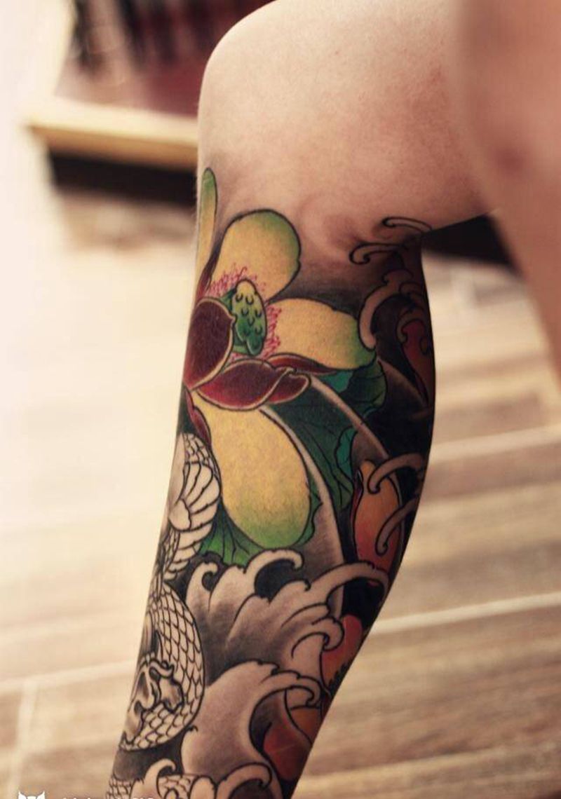 • T网红王老大花腿龙纹身图片_腿部新传统纹身图案