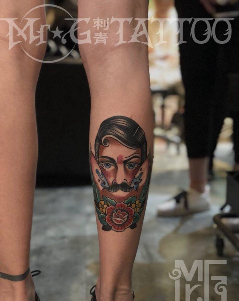 • T包小腿吹火男+阿多福纹身图片_腿部老传统新传统吹火男阿