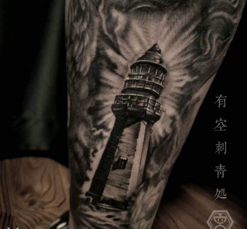 明灯照海神纹身图片_腿部欧美写实纹身图案