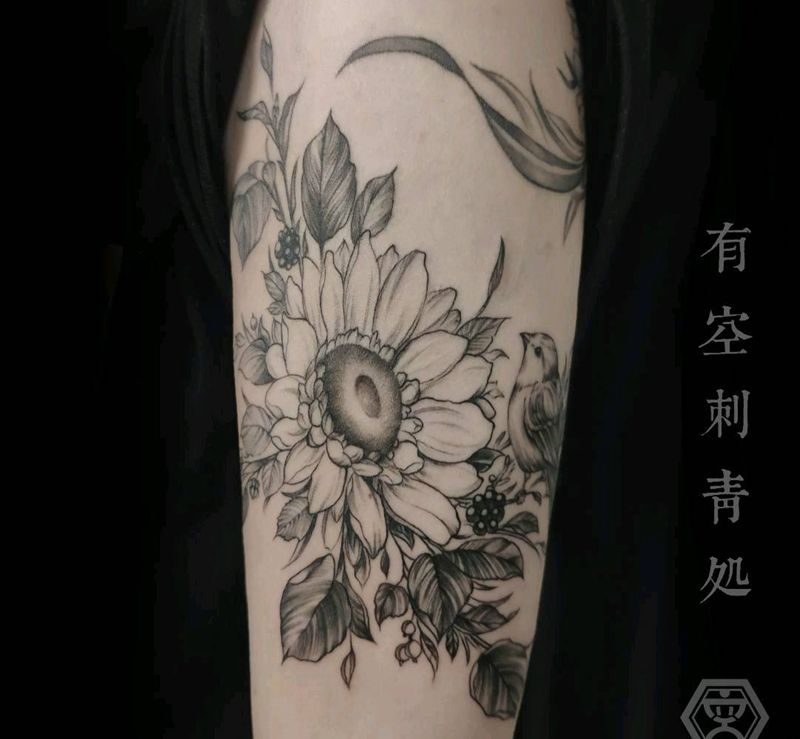当前位置: 首页 >江苏省镇江市纹身店-有空刺青処纹身图案>肥鸟向日葵纹身图片_手臂点刺纹身图案