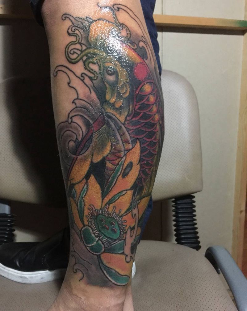 当前位置: 首页 >江苏省泰州市纹身店-赐墨堂·TATTOO纹身图案>锦鲤纹身图片_传统鲤鱼鱼腿部小腿纹身图案