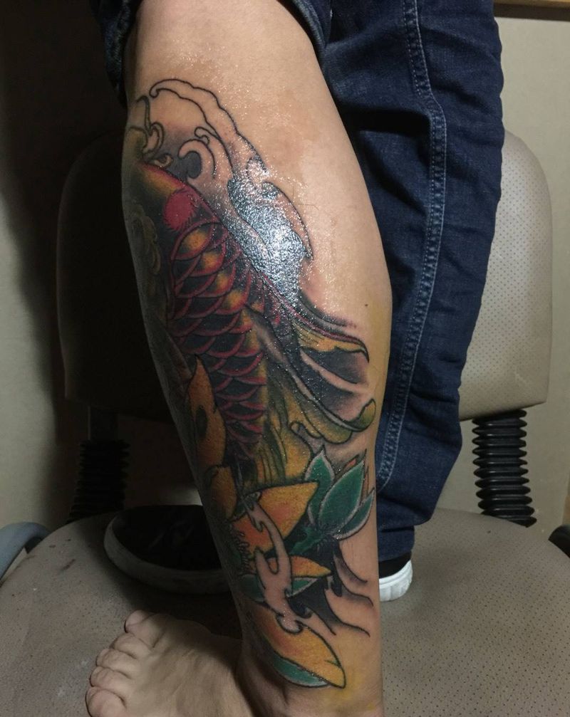 当前位置: 首页 >江苏省泰州市纹身店-赐墨堂·TATTOO纹身图案>锦鲤纹身图片_传统鲤鱼鱼腿部小腿纹身图案