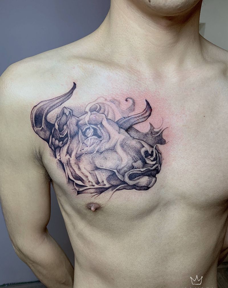 牛头纹身图片_胸部点刺暗黑纹身图案