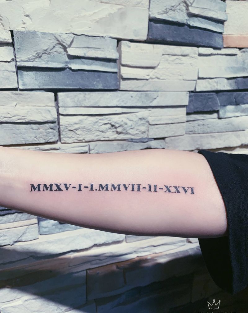 当前位置: 首页 >江苏省镇江市纹身店-三清斋刺青纹身图案>罗马数字纹身图片_手臂花体字罗马数字纹身图案