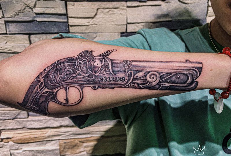 当前位置: 首页 >江苏省镇江市纹身店-三清斋刺青纹身图案>老枪纹身图片_手臂New School欧美写实老枪 枪纹身图案