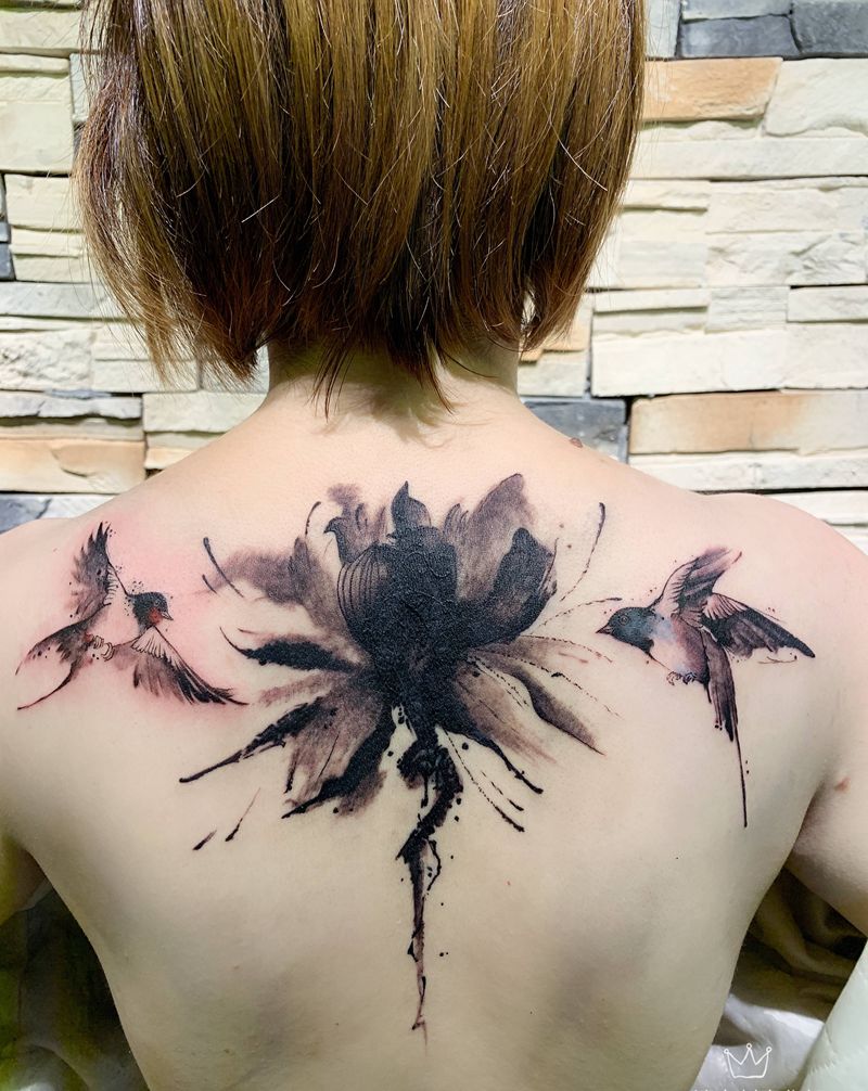遮盖作品纹身图片_背部水墨燕子 水墨纹身图案