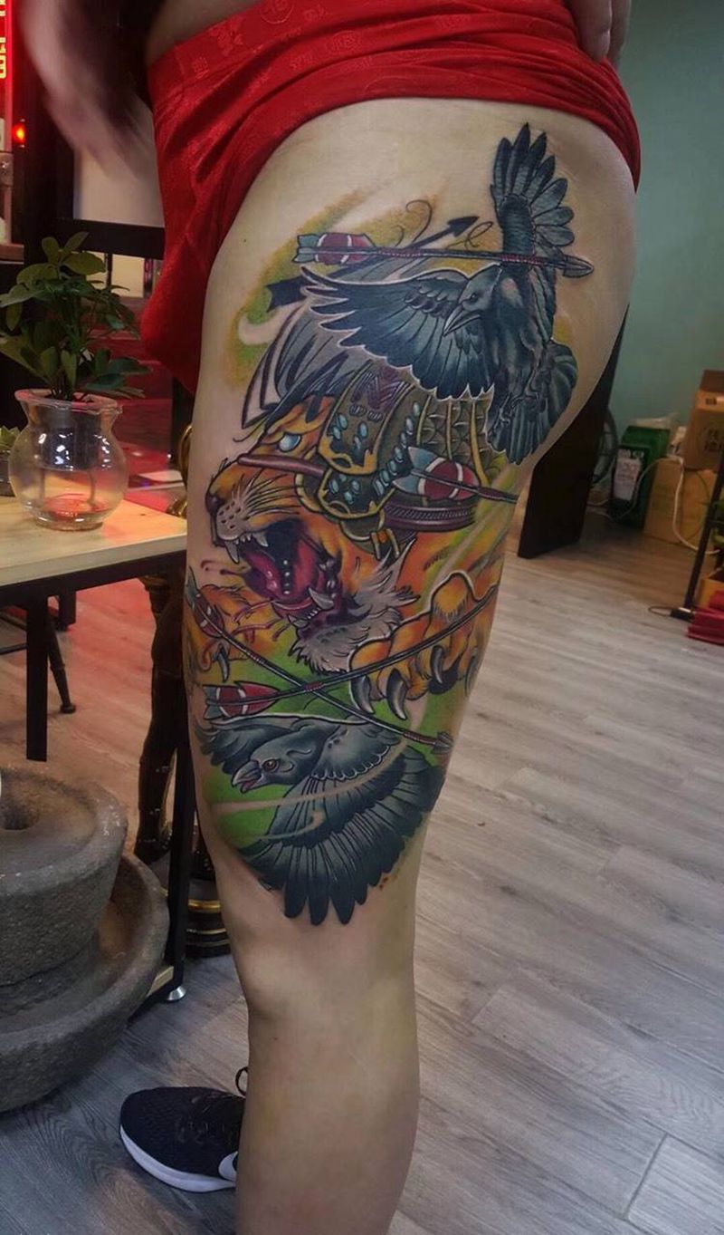 • T网红王老大花腿龙纹身图片_腿部新传统纹身图案