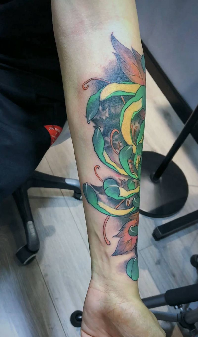 当前位置: 首页 >江苏省泰州市纹身店-颜•刺青 纹身工作室纹身图案>菊纹身图片_手臂新传统纹身图案