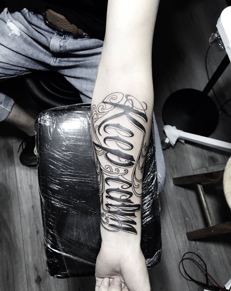 当前位置: 首页 >江苏省泰州市纹身店-颜•刺青 纹身工作室纹身图案>小臂花体纹身图片_手臂花体字纹身图案