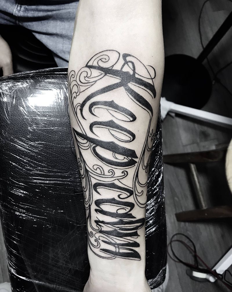 当前位置: 首页 >江苏省泰州市纹身店-颜•刺青 纹身工作室纹身图案>小臂花体纹身图片_手臂花体字纹身图案