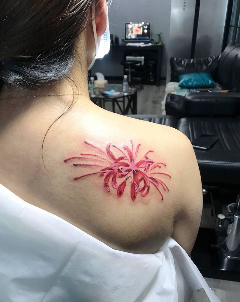 当前位置: 首页 >江苏省泰州市纹身店-颜•刺青 纹身工作室纹身图案>彼岸花纹身图片_肩部水彩纹身图案