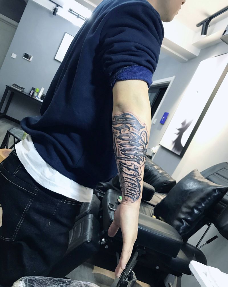 当前位置: 首页 >江苏省泰州市纹身店-颜•刺青 纹身工作室纹身图案>花体纹身图片_手臂花体字纹身图案