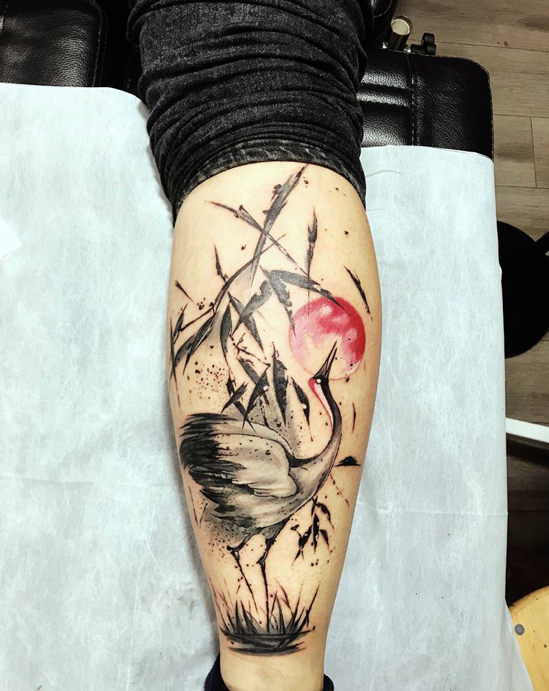 闲云野鹤纹身图片_腿部水墨纹身图案