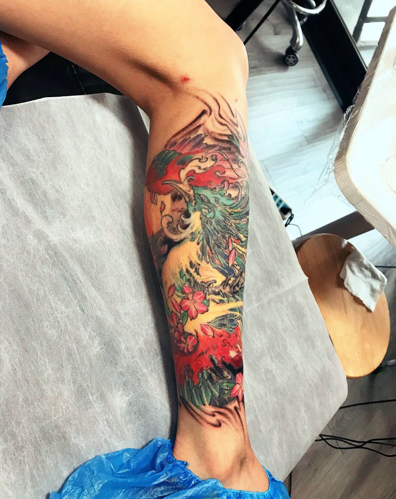 当前位置: 首页 >江苏省泰州市纹身店-颜•刺青 纹身工作室纹身图案>凤凰纹身图片_腿部新传统纹身图案