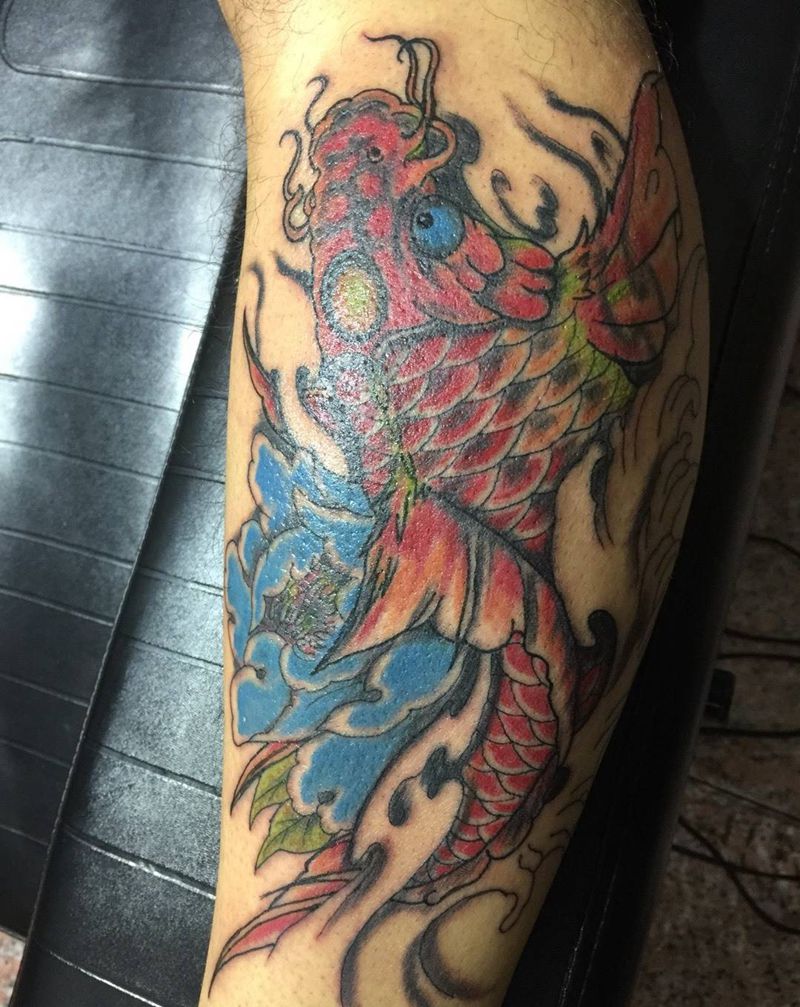 当前位置: 首页 >江苏省泰州市纹身店-绣龙堂刺青纹身图案>小腿锦鲤纹身图片
