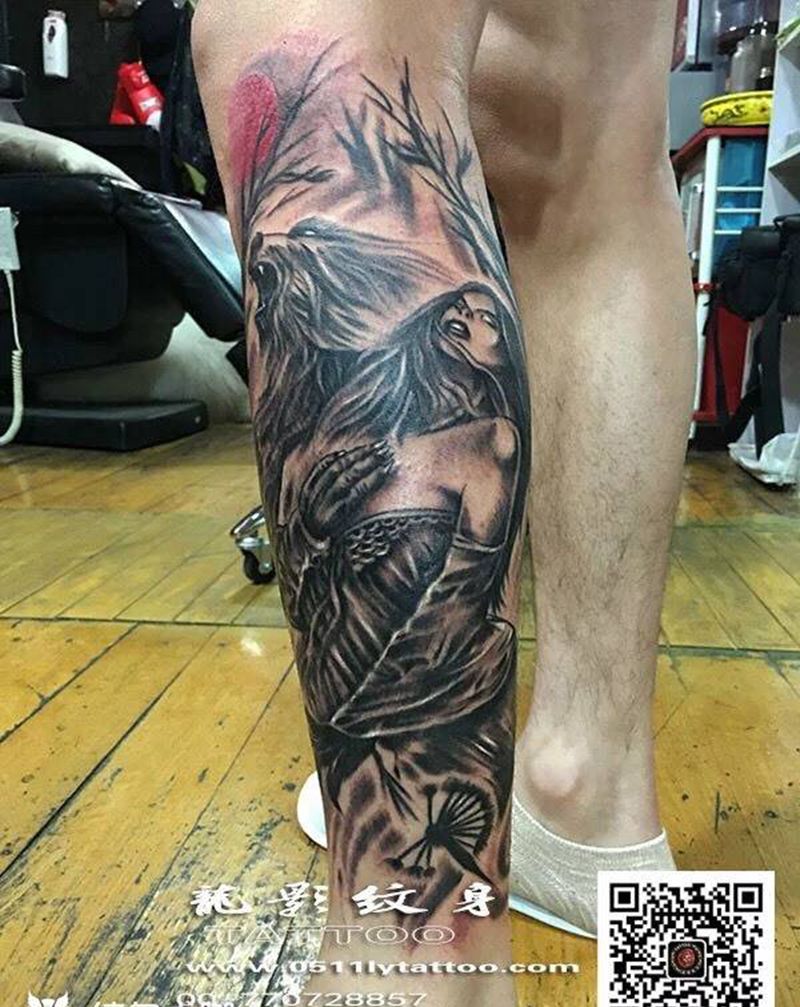 当前位置: 首页 >江苏省镇江市纹身店-镇江龙影纹身纹身图案>兽变半包腿纹身图片