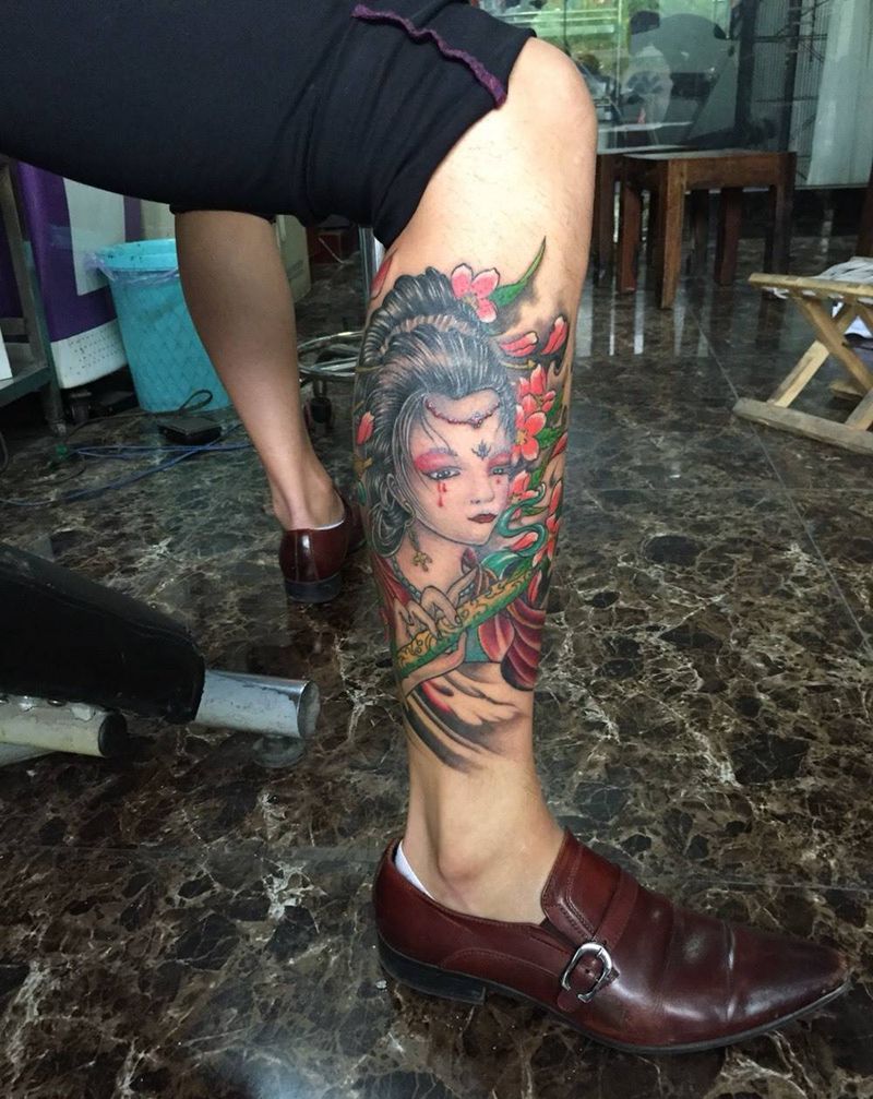 • T网红王老大花腿龙纹身图片_腿部新传统纹身图案