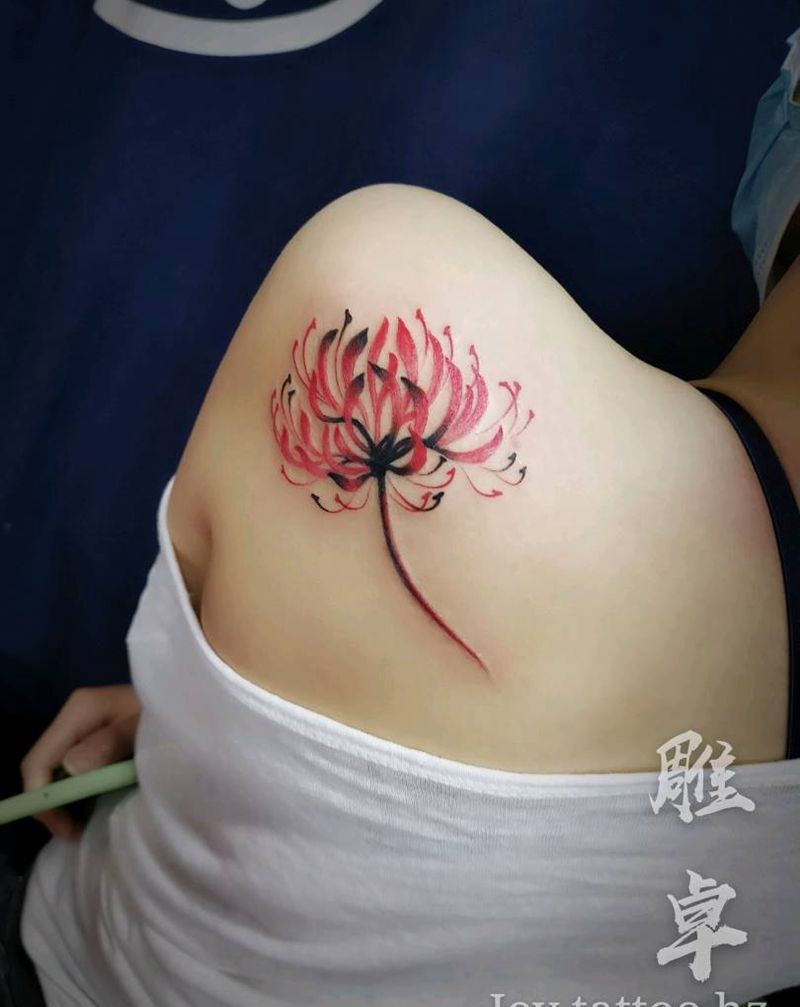 彼岸花纹身图片_肩部新传统水彩彼岸花纹身图案