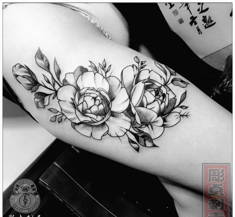 当前位置: 首页 >浙江省杭州市纹身店-雕卓刺青纹身图案>大腿线条牡丹花纹身图片_成品腿部清新植物性感大腿线条牡丹纹身图案