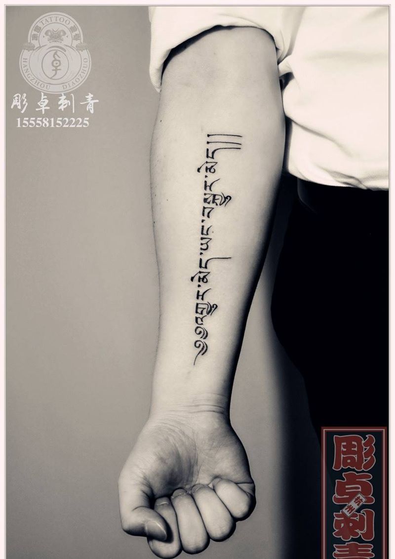 小臂梵文纹身图片_成品手臂传统字符梵花杭州纹身图案