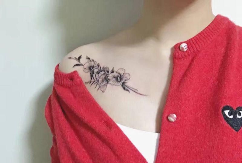 锁骨清新花儿纹身图片_成品肩部清新植物锁骨线条花杭州纹身图案