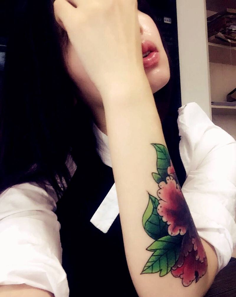 牡丹遮盖纹身图片_成品手臂腿部传统植物牡丹修改遮盖杭州纹身图案